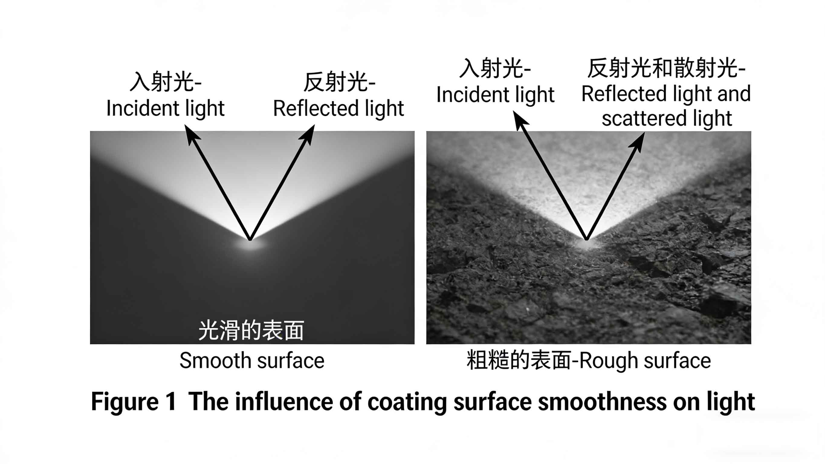 では、マット加工とは何でしょうか?その核心は、塗膜に微細な凹凸を作ることです。この凹凸に光が当たると、拡散反射が起こり、鏡面反射が抑制され、光が様々な方向に散乱することで、最終的にマット効果が得られます。物体表面におけるこの光の反射現象は、図1に示されています。マット剤は、塗膜の光沢を変化させる物理的な手段です。乾燥過程で水分が蒸発すると、マット剤が表面に移動し、微細な凹凸を作り出します。これにより表面粗度が増加し、鏡面反射が減少します。